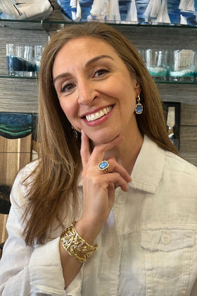 Exquisitely crafted in malleable 18k gold-dipped brass, this cuff is a masterful sculpture adorned with hand-set crystals delicately punctuating th...